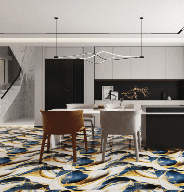 This tile exudes modern luxury with artistic flair. The combination of rich blue and shimmering gold enhances contemporary, transitional, or high-end interiors, adding depth and visual interest. Its dynamic pattern makes it perfect for statement areas, allowing the surrounding décor and furnishings to complement its bold, elegant design.