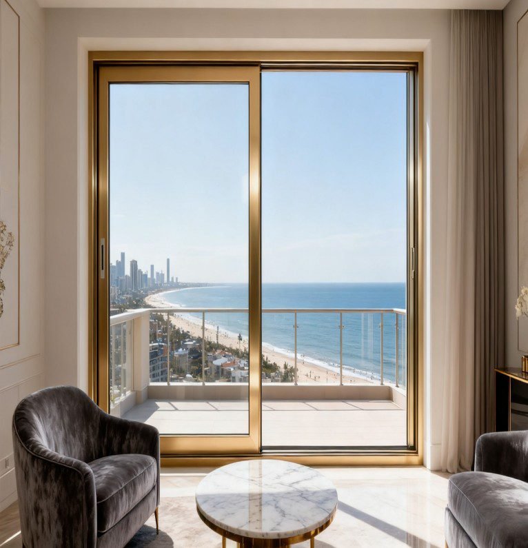 Brass Edge Multi Sliding Window features a brass-colored aluminum alloy frame. Doors and windows slide horizontally on concealed tracks, enabling stacked or hidden configurations for a spacious, seamless opening effect. Brass trim adds a luxurious metallic finish with corrosion resistance; full-height glass maximizes natural light and offers expansive views. Equipped with rollers and weatherproof seals, this system ensures energy efficiency and quiet operation, making it ideal for high-end residential or hotel spaces.