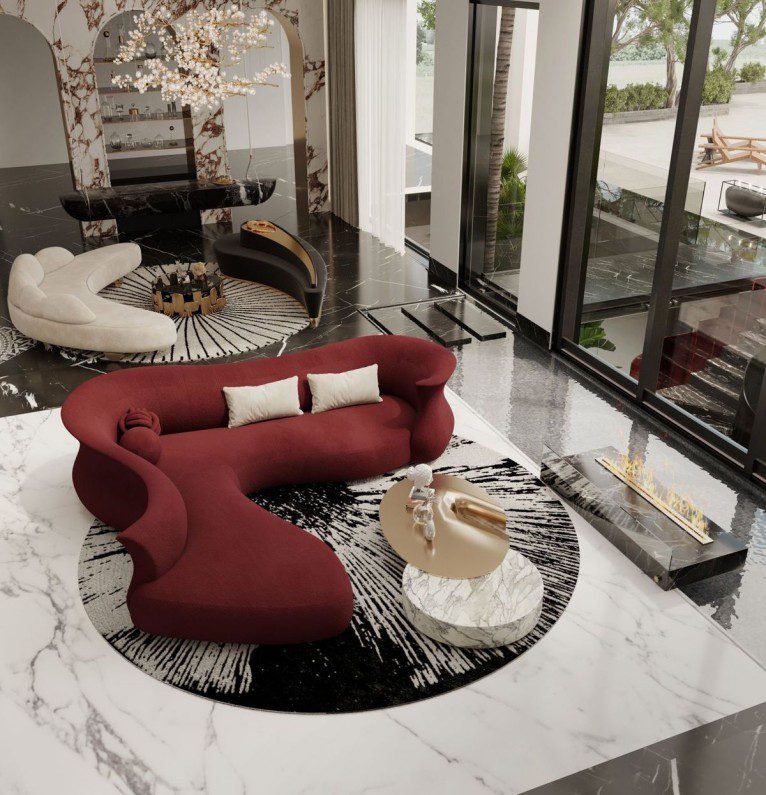 This sofa features a striking curved silhouette that adds depth and character to any room. The deep burgundy fabric enhances the room’s aesthetic, creating a rich, welcoming atmosphere. The plush cushions provide comfort, making it ideal for lounging or entertaining guests. The clean lines of the design maintain a sleek, modern look, while the solid construction ensures long-lasting use.
