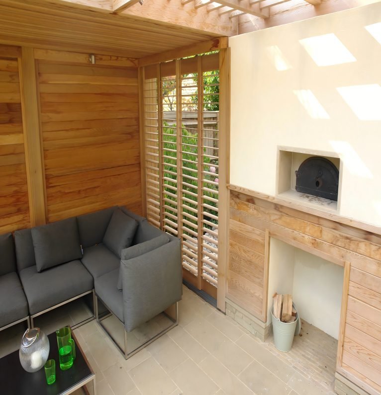 As shown in the illustration, this project creates a warm, rustic yet modern indoor lounge area. Walls and ceilings feature expansive cedar wood paneling. Spacious cedar shutters employ a multi-panel folding design, allowing natural light to filter through horizontal slats into the interior. This fosters a cozy and comfortable space, emphasizing natural materials, indoor comfort, and visual connectivity with the outdoor environment.
