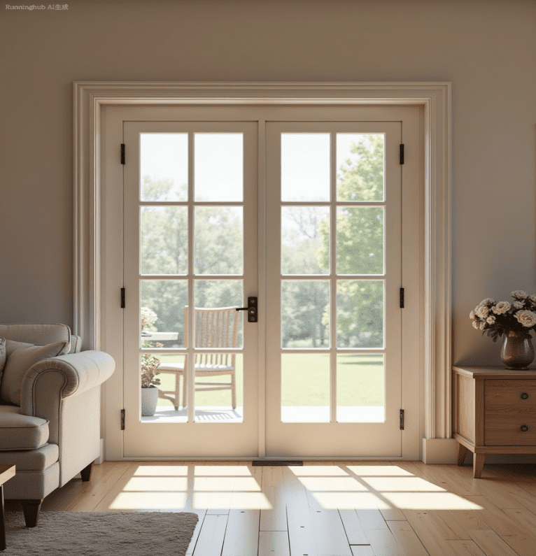 Wooden French double doors consist of a wooden frame and glass panels. This type of door is sturdy and durable, allowing for frequent opening and closing, while the glass panels allow light to pass through and maintain visual continuity between different areas. This type of door is commonly used for patios, living room entrances, or as interior partitions. The design typically includes standard hinges and handles for ease of daily use.