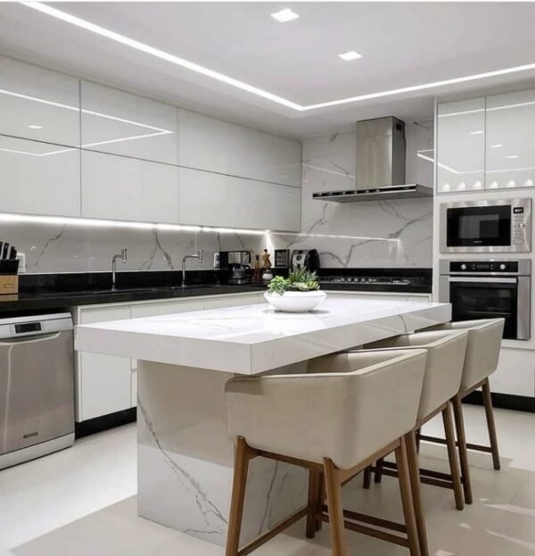 The gleaming white kitchen cabinets reflect the room’s LED light, creating a bright and airy feel. The accompanying marble island adds a touch of understated luxury. Stainless steel appliances are seamlessly integrated with the cabinetry, while LED light strips accentuate the backsplash. The final result is a refined and elegant space that combines brightness with understated luxury.