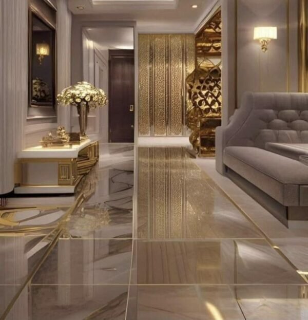 Gold accented luxury marble flooring is suitable for interiors where visual richness and architectural detailing are important. Its reflective stone surface is suitable for foyers, spacious living rooms, dining rooms and hotel-style reception areas. It naturally complements warm lighting, metallic finishes and decorative wall elements. This flooring is often used to integrate the floor itself into the overall interior design style.