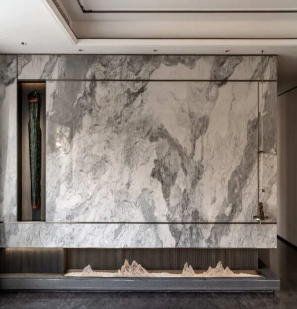 Grayish-white marble wall panels are often used in interior spaces where a calm and structured visual backdrop is desired. Their fluid, textured patterns are well-suited for living rooms, bedrooms, and home offices. They pair naturally with wood paneling, metal accents, and soft lighting. These wall panels are also ideal for reception areas and commercial spaces, where the balanced and continuous stone texture helps define the space.