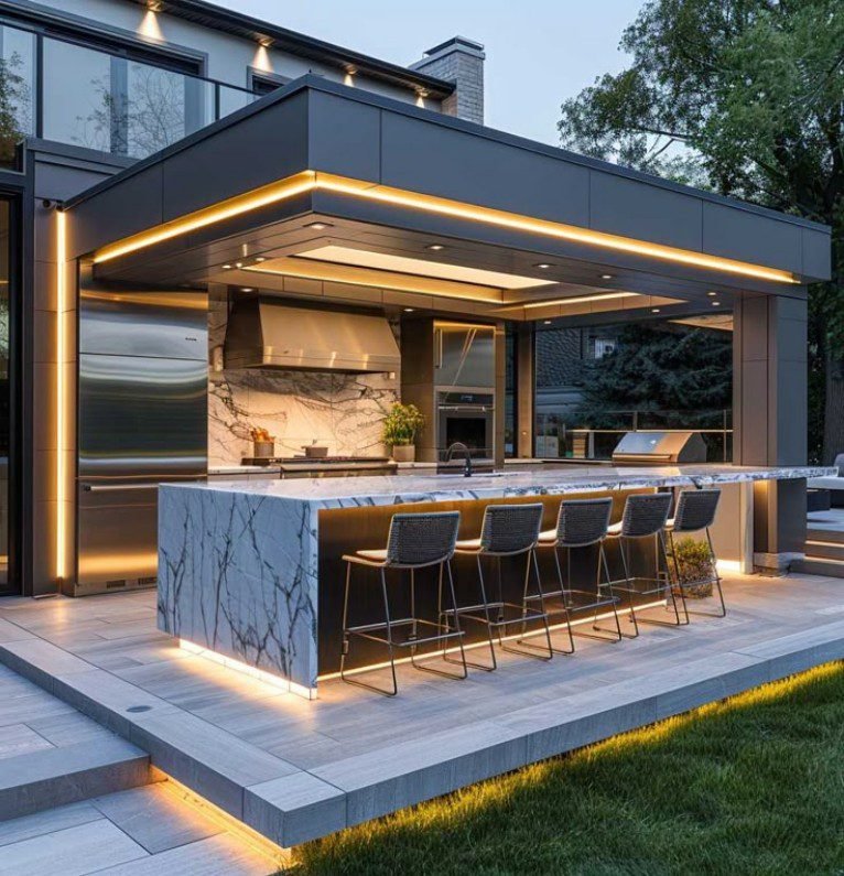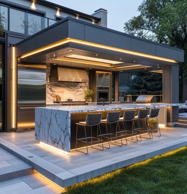 • Integrated LED Lighting: Concealed LED lighting embedded within the cabinets enhances visibility during nighttime food preparation and creates a warm, organized ambiance for the outdoor living area.