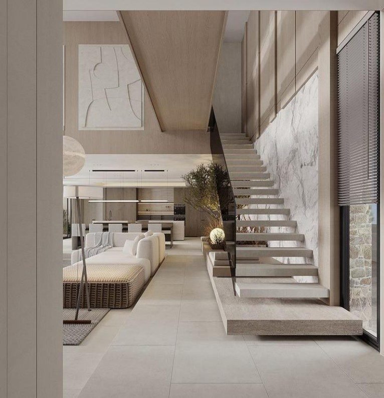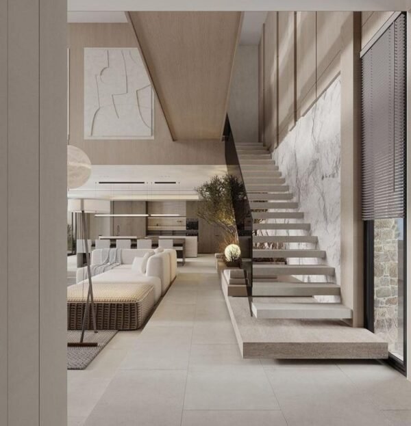 This staircase emphasizes minimalism and natural elegance. The light gray stone provides a neutral, calming tone, while the floating design enhances visual openness. Its clean lines and sculptural silhouette suit modern, minimalist, or luxury interiors, making it a refined focal point that complements natural materials, neutral palettes, and open layouts.