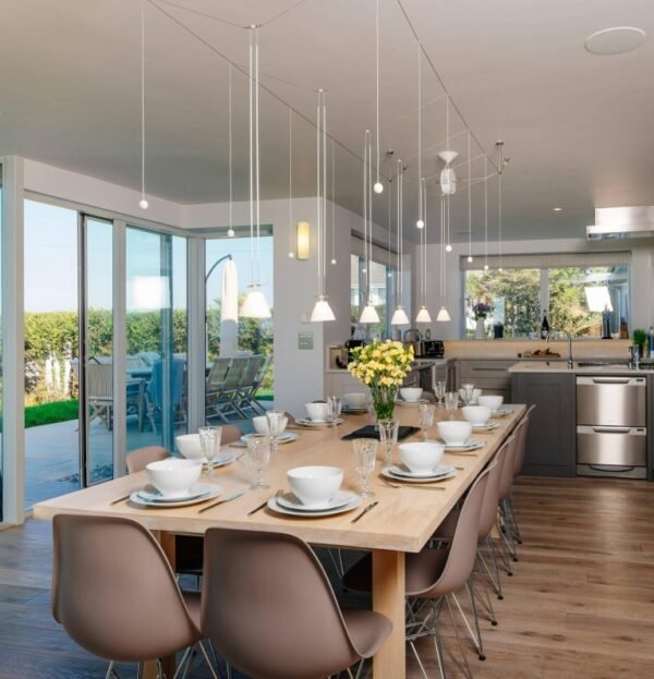 This dining table combines modern design with natural wood textures. The light wood finish enhances brightness and warmth, while the minimalist silhouette fits a variety of interiors. Its versatile style complements contemporary, Scandinavian, or transitional spaces. The table balances elegance and practicality, offering both visual appeal and functionality for everyday dining.