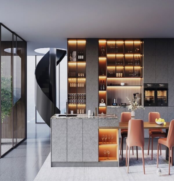 This Modern Grey Kitchen Cabinets masterfully balances luxury and value, creating an atmosphere of refined elegance through the clever combination of solid plywood and transparent glass. The backlit interior design casts a soft glow, effectively softening the structural lines of the space. By transforming ordinary storage areas into illuminated display zones, the cabinet adds visual depth and dimension. This design approach ensures the cabinets possess both a refined texture and the durability required for daily use.
