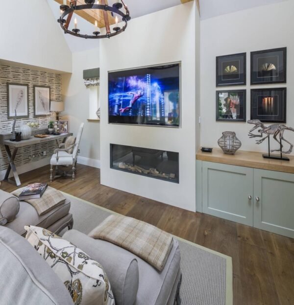 This layout places the television and fireplace side by side along one wall, creating a central gathering area. It complements the hardwood floors, neutral-toned fabrics, and natural materials. The design creates a relaxed and comfortable living space, consolidating audiovisual equipment and heating elements into a single area for convenient daily use. Both the dimensions and finishes can be customized, and additional storage can be incorporated to accommodate different room layouts.