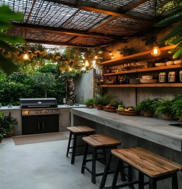 Rustic outdoor wood outdoor kitchen cabinet and concrete countertops create an outdoor kitchen brimming with natural charm. Wooden benches paired with metal bench racks and a woven roof add a touch of country style, while potted plants and hanging lights create a warm and inviting atmosphere, perfect for the whole family to cook and gather by the garden. Add a stainless steel grill, and it will be a truly joyful space.