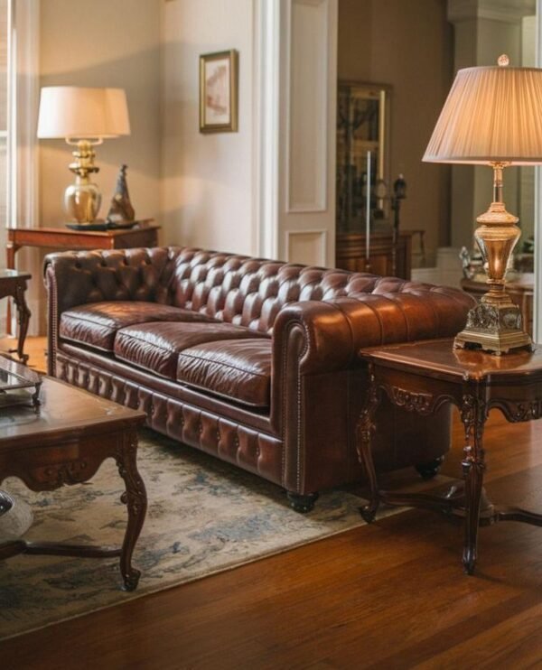 This Chesterfield sofa features a vintage-inspired design with luxurious brown leather that enhances any room’s aesthetic. The deep-button tufting and rolled arms offer a distinctive, classic appeal. The plush cushions provide comfort for lounging, while the solid construction ensures long-term support. Perfect for traditional, vintage, or eclectic decor, this sofa complements a variety of interior styles.