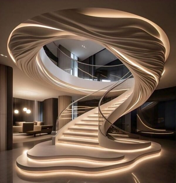 This staircase blends modern luxury with organic form. The wavy structure adds motion, while the lighting highlights every curve. It fits perfectly in minimalist interiors or high-end modern spaces that favor sculptural elements. Whether placed in an open atrium or against a feature wall, it instantly becomes a standout design feature.
