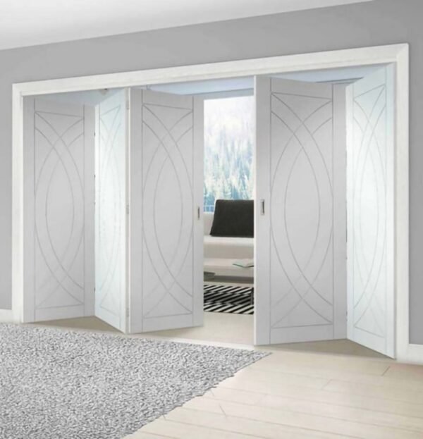 About Geometric-Carved White bifold barn doors