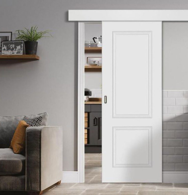 Clean White Paneled Sliding Door features a single sliding panel with raised rectangular detailing and a white finished surface. The door moves along a top-mounted track, allowing it to open and close without swinging into the room. The panel size and layout make it suitable for interior door openings such as kitchens, hallways, or connecting rooms.