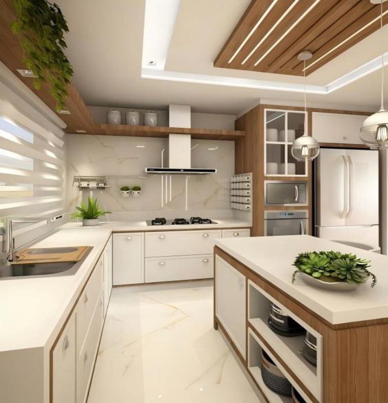 Wood Accent White Kitchen Cabinet paired with warm solid wood details adds a touch of natural luxury to the space. Open glass-door cabinets and a wood-slatted ceiling showcase the clever integration of natural textures throughout the kitchen, while a marble backsplash brings understated elegance—perfect for a kitchen style that embraces a natural aesthetic. These white and wood cabinets blend modern design with natural warmth.
