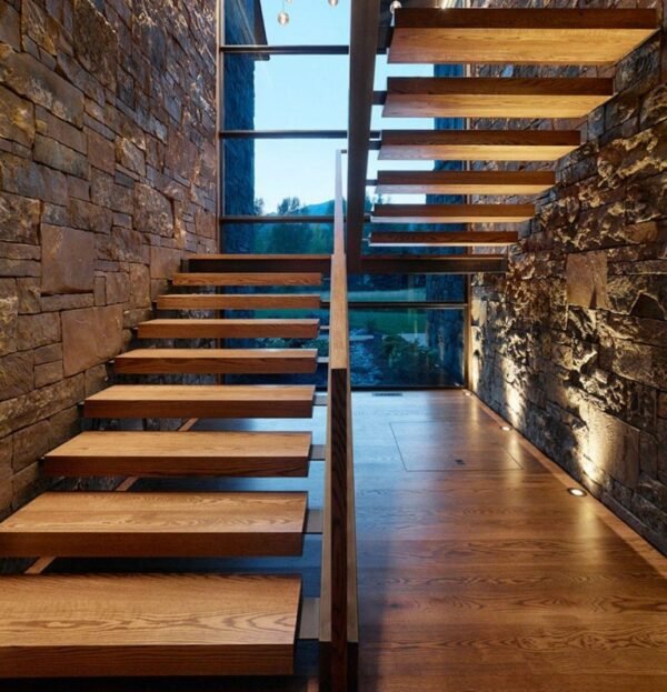 Crafted from premium solid wood, the treads are carefully finished to showcase their natural grain while ensuring comfortable footing. The supporting structure—typically hidden metal brackets or reinforced timber—maintains the floating effect and structural integrity. With proper care, the wood retains its rich color, texture, and timeless appeal, making the staircase a lasting centerpiece.