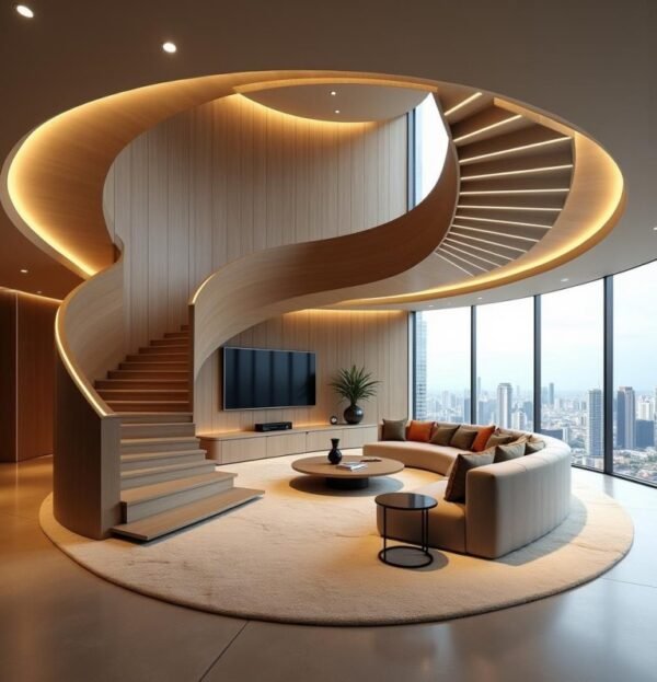 This staircase emphasizes modern minimalism with a dynamic, luminous twist. The natural wood tones provide warmth and tactile appeal, while the spiral design adds sculptural elegance. LED lighting accentuates each step and enhances the staircase’s visual flow, making it perfect for open layouts, contemporary interiors, or spaces seeking a sophisticated focal point.